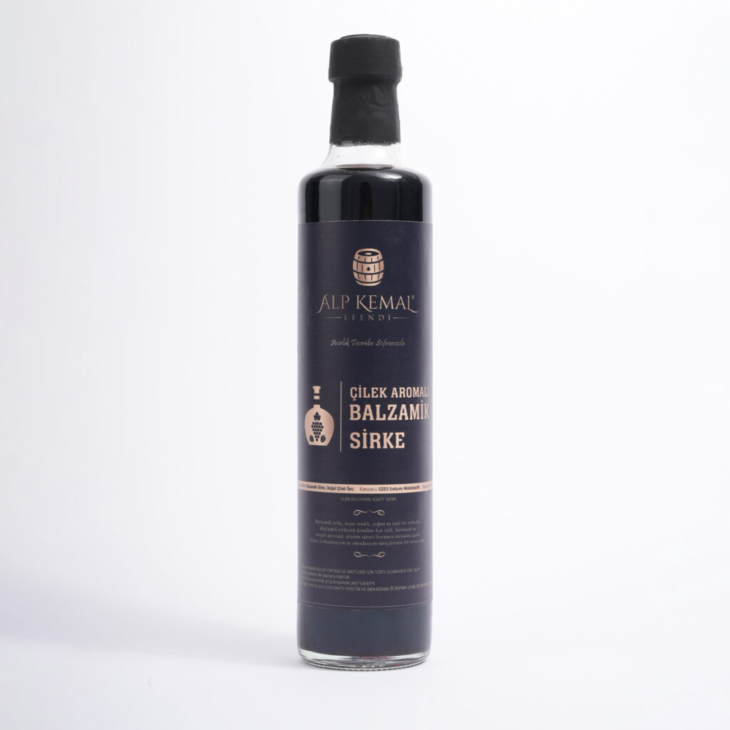 Çilek Aromalı Balzamik Sirke, kaliteli üzüm şırasından elde edilen balzamik sirkenin, doğal çilek aromasıyla buluşturulmasıyla hazırlanan özel ve gurme bir üründür. Dengeli tatlı-ekşi yapısı ve meyvemsi aroması sayesinde klasik balzamik sirkeden ayrılır, sofralara farklı ve sofistike bir lezzet katar.